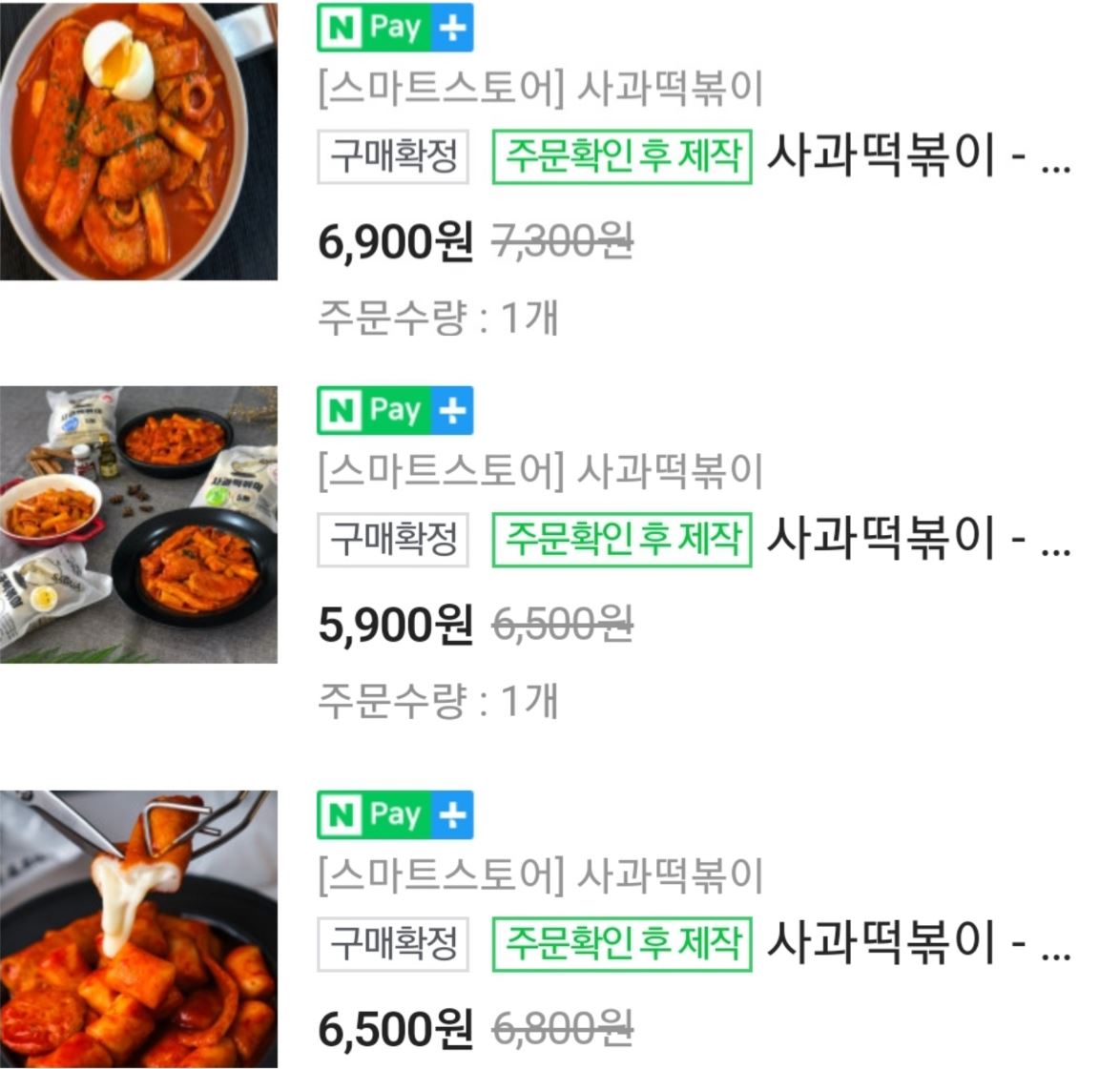 저는 밀떡, 쌀떡, 어볶이 각각 한 개씩 주문했습니다.